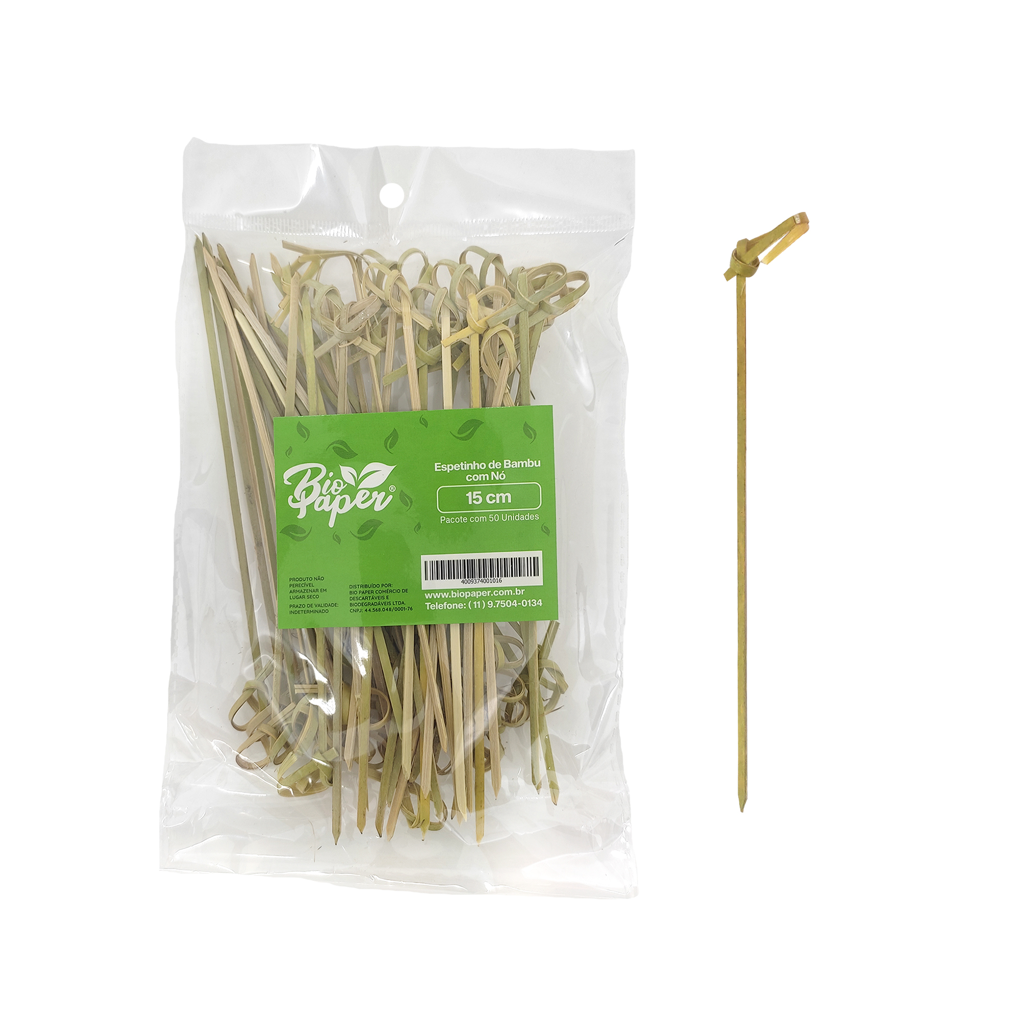 Os espetos de bambu com nó decorativo (Knotted) da Bio Paper combinam estética, higiene e sustentabilidade. São ideais para servir finger foods, petiscos, lanches, frutas e coquetéis, agregando charme e praticidade em eventos, restaurantes, buffets ou uso doméstico. Produzidos com bambu 100% natural, um material renovável e biodegradável, oferecem alta resistência à umidade, não soltam fiapos e apresentam propriedades bactericidas naturais, garantindo segurança no contato com alimentos. Seu design com nó decorativo valoriza a apresentação, tornando cada prato mais elegante. | Espeto de Bambu com Nó 15 cm | Indicado para: restaurantes, buffets, lanchonetes, bares, eventos, festas, food trucks, catering e uso doméstico com toque gourmet | Ideal para ambientes que prezam por higiene e estética | Design decorativo com nó elegante | Produzido com bambu esterilizado e resistente | Pontas amoladas para fácil perfuração de alimentos | Produto 100% natural, biodegradável e compostável | Higiênico, não solta fiapos e pronto para uso | Ideal para uso único com responsabilidade ambiental | Modelo: Espeto com nó tipo "Knotted" | Comprimento: 15 cm | Cor: Natural (verde claro/amarelado) | Material: Bambu natural esterilizado | Uso: Finger foods, lanches, frutas, drinks | Biodegradável: Sim | Compostável: Sim | Uso único: Sim | Embalagem: Pacote com 50 unidades | Tamanho da embalagem: 20,5 cm | Código: -9375