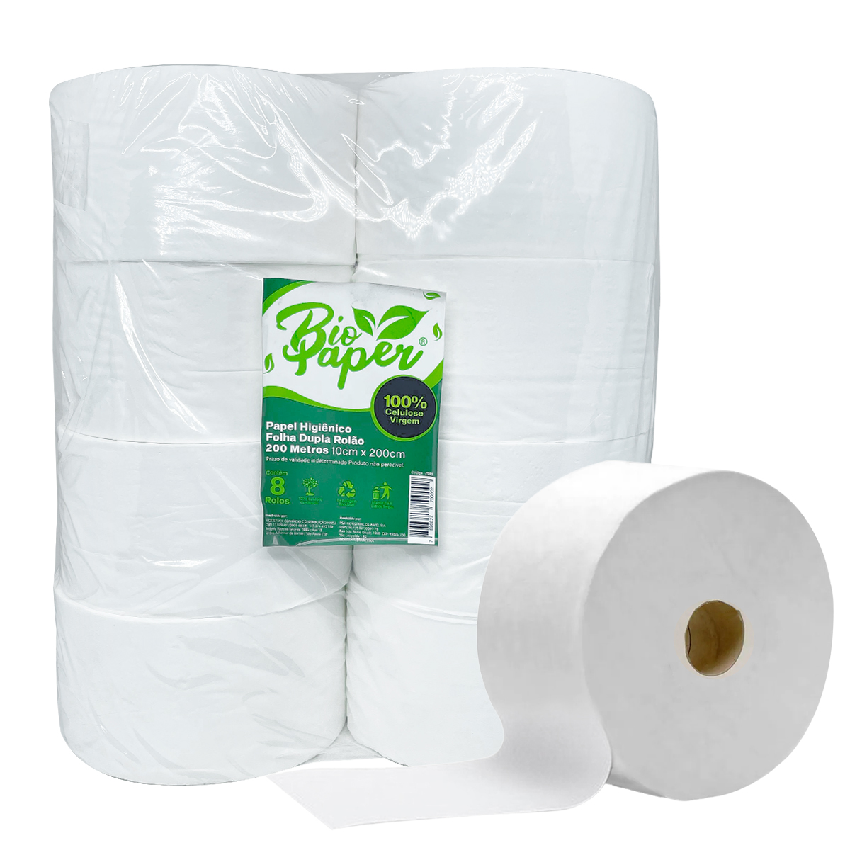 O papel higiênico bobina folha dupla Bio Paper é ideal para ambientes com alto fluxo de pessoas, oferecendo conforto, higiene e economia. Sua composição 100% em celulose garante maciez e resistência superiores, enquanto o formato em rolo de 200 metros proporciona maior durabilidade e menor necessidade de reposição. É a solução ideal para banheiros de hospitais, restaurantes, escritórios, fábricas, clínicas e estabelecimentos comerciais que prezam por qualidade e eficiência. | Papel Higiênico Rolão Folha Dupla 200m x 10cm | Cor: Branco | Tipo: Folha dupla | Modelo: Papel higiênico rolão (bobina) | Composição: 100% celulose virgem | Embalagem: Pacote com 8 rolos | Tamanho da embalagem: 40 cm x 37,5 cm x 18 cm | Medidas do rolo: 200 metros (comprimento) x 10 cm (largura). | Código: -2985